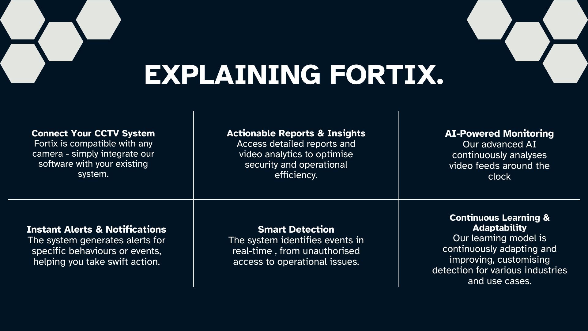 But we don’t stop at capturing footage. Every Fortix AI camera is backed by our proprietary AI object recognition engine, hosted securely in the cloud. This enables: